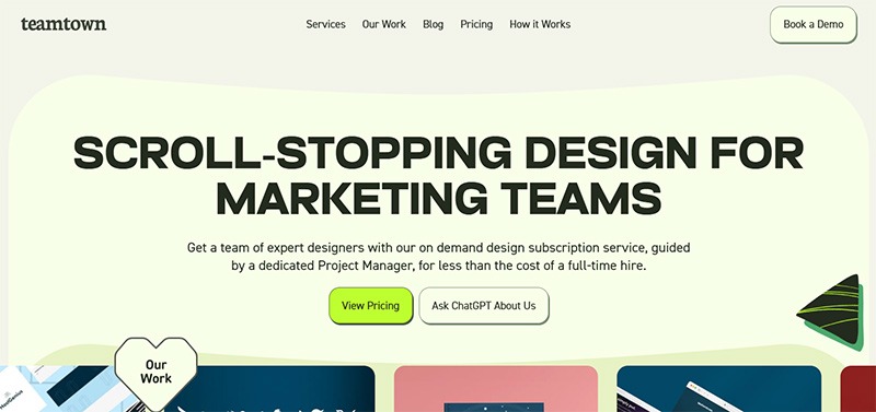 Offering scroll-stopping design for marketing teams, Teamtown is another recommended on-demand subscription service. It boasts of expert marketing graphic design, which includes brand identity, infographics, logos, and social media graphics, to name a few. It operates on an hourly subscription model, allowing you to choose how many hours you need per month.