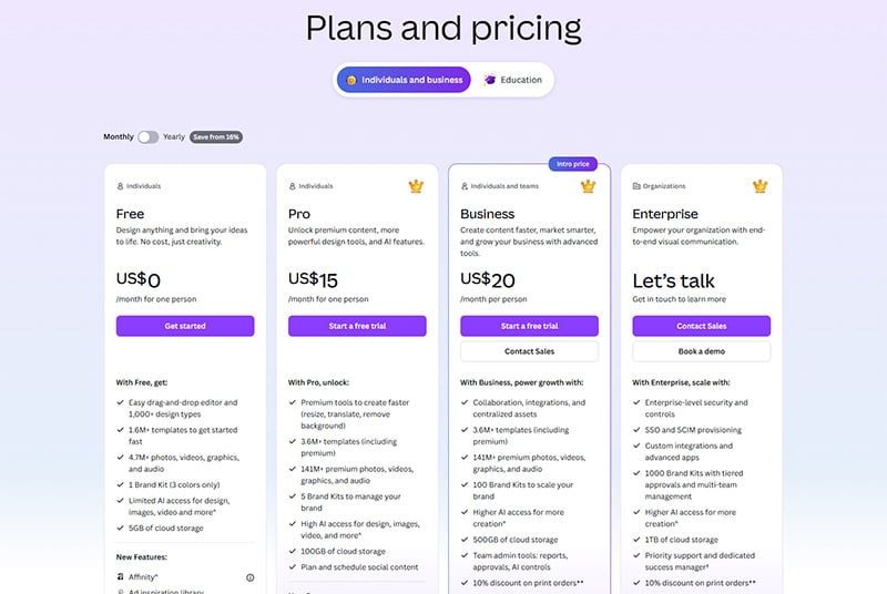 With unlimited access to its design tools and content, Canva’s $15 monthly fee is a steal. Take a look at their pricing plans: