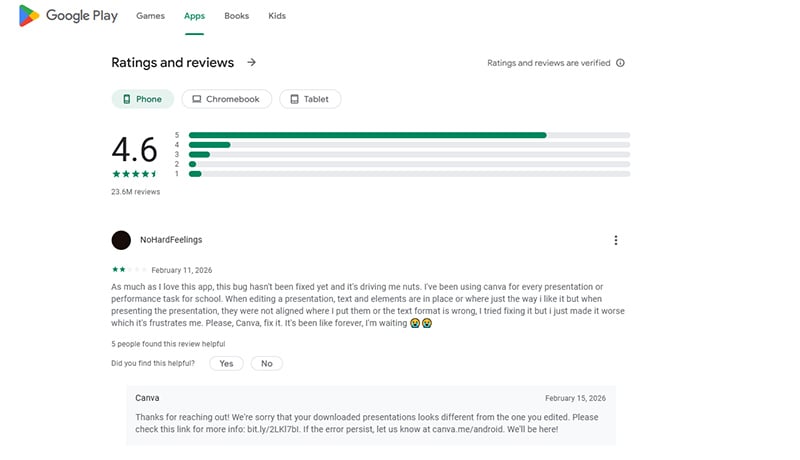 Canva has high ratings: 9.2/10 on TrustRadius, 4.7/5 on Capterra, from over 13,000 users, and 4.6/5 on Google from more than 24.5 million reviewers.