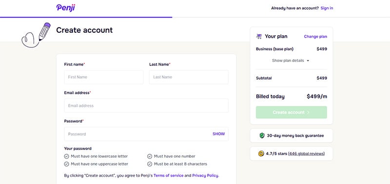 Similarly, Penji’s sign-up requires you to choose a plan, offers a field for entry (good for promo codes), requires payment information, and upon sign-up, you can start requesting designs right away.
