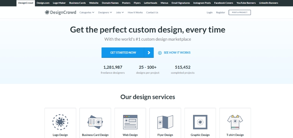 Here’s another design contest-style service to get multiple designs. DesignCrowd lets you submit a design request to get designs from various designers. You can request one project at a time to ensure timely submissions and get variations for one design request. However, if you aren’t fond of the design contest format, you can hire freelancers based on their specialties or countries. The service has around 1,000,000 freelancers who may submit their designs. Plus, there’s an average of 25 to 100 designs per project.