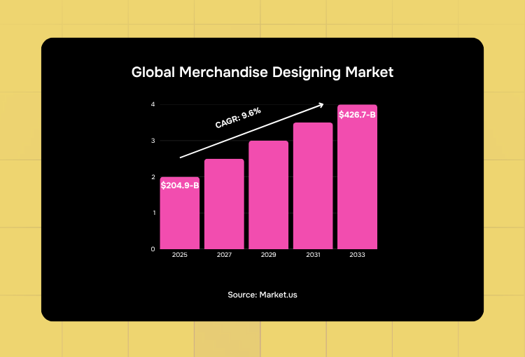 Data tells us that $204-billion global merchandise designing market in 2025 is projected to grow to $426.7 billion in 2033, with a Compounded Annual Growth Rate of 9.6%.