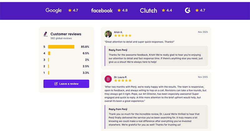 Don’t take our word for it – let the numbers speak for themselves. Penji has thousands of 5-star reviews across G2, Facebook and Google.